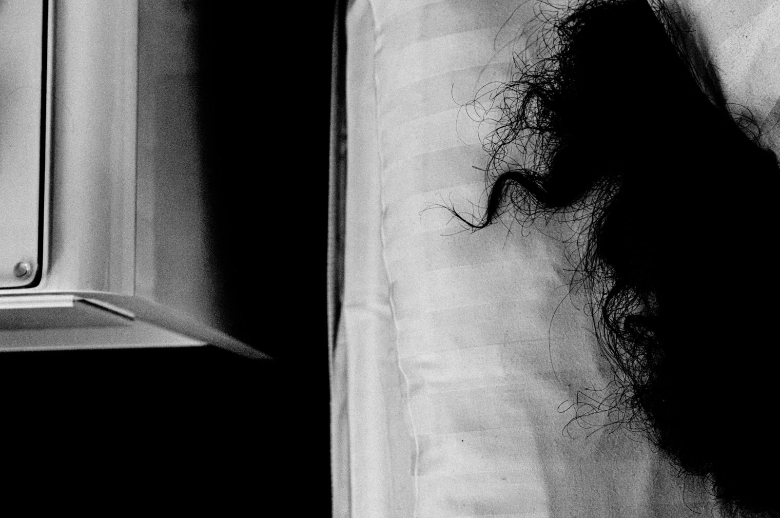 La série traverse des lieux où cette blessure a laissé sa trace. Dans la Forêt-Noire autour de Todtnauberg, des paysages de brume et de silence — la beauté qui a abrité la complicité. À Amsterdam, une seule image : une mèche des cheveux noirs de ma fille, prise après la visite de la maison d'Anne Frank.